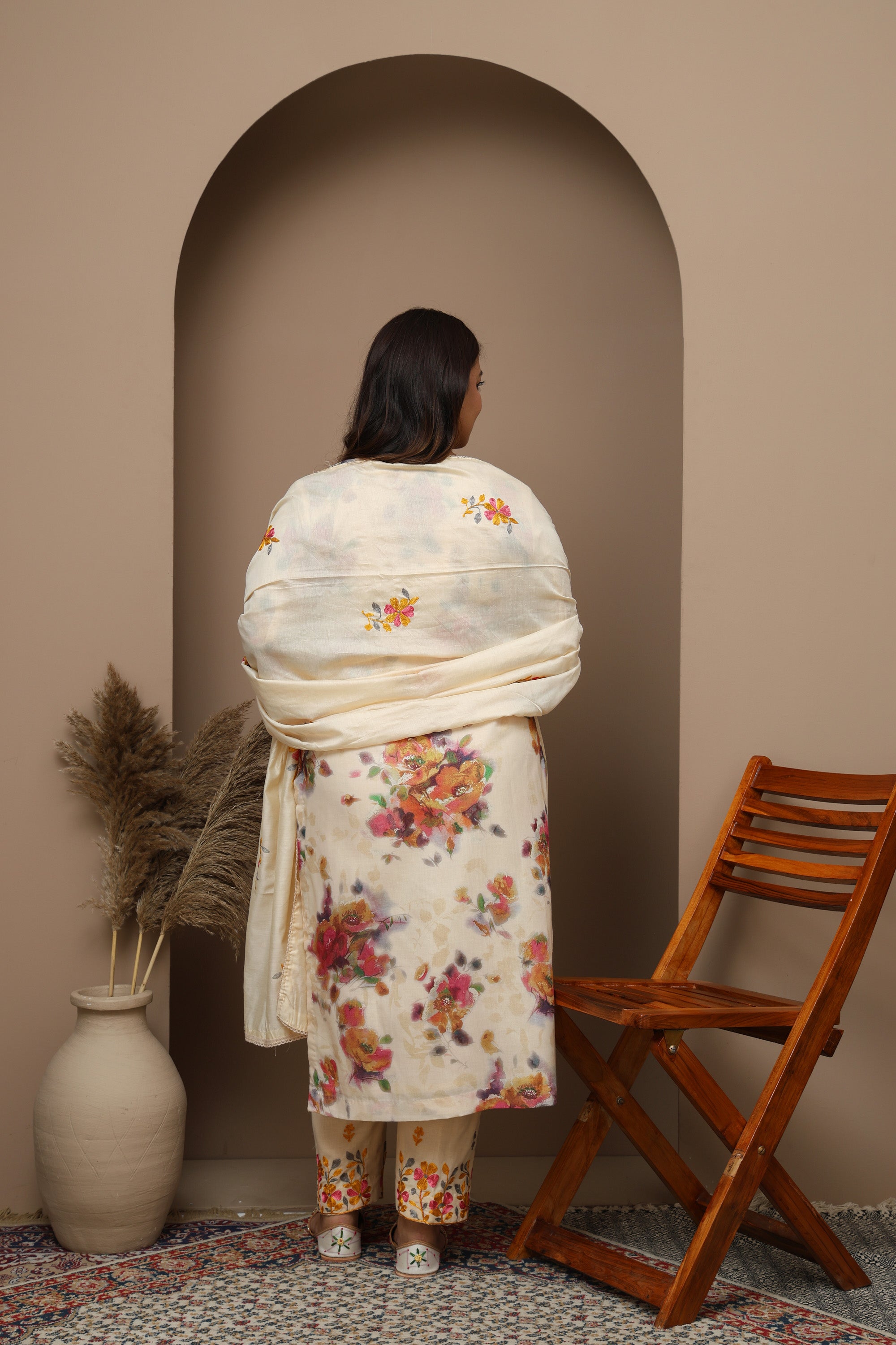 Off-White Floral Print Suit Set with Embroidered Neckline